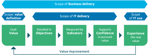Measuring these indicators is done by quality and value measuring activities, such as testing. This measuring results in information that the people involved use to form an opinion and determine to what extent they are confident that the pursued value can be achieved. After they make the decision to use the IT system, the organization will experience the real value. This experience is used to further improve the value for the organization in a next iteration of delivery. This process of business delivery, and the IT delivery as part of it, is visualized in the VOICE model. This is a generic model, relevant for all kinds of IT delivery lifecycles that support business delivery (see figure).