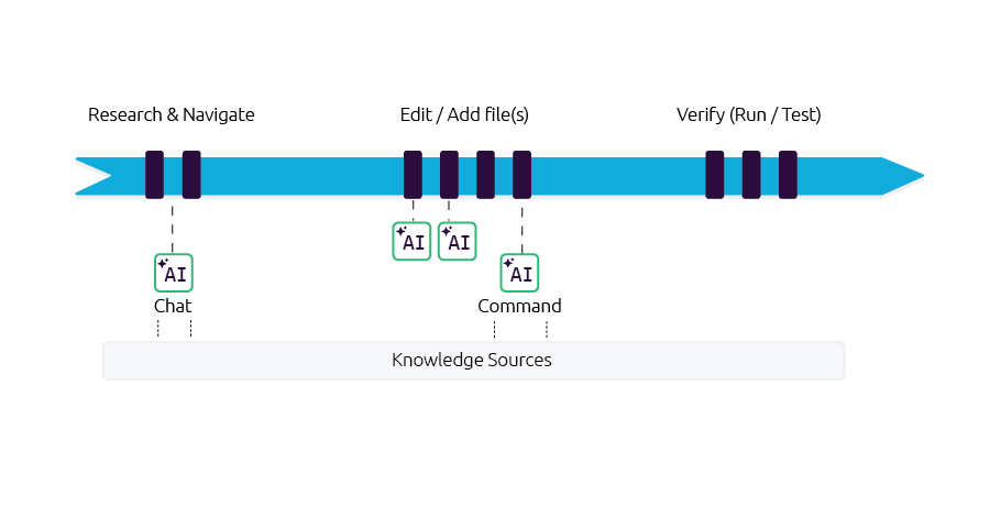 This shifted after 2022 with AI assistants. AI assistants support developers with code suggestions, and auto completion. The developer’s workflow has not really changed, but now, duringediting, the integrated AI assistant, autocompletes lines of code and the user hits the “TAB” button to accept the change suggested by the AI assistant (also known as ‘tab to complete’).Additionally, a chat feature is available that enables developers to pose queries and copy responses directly to the IDE.