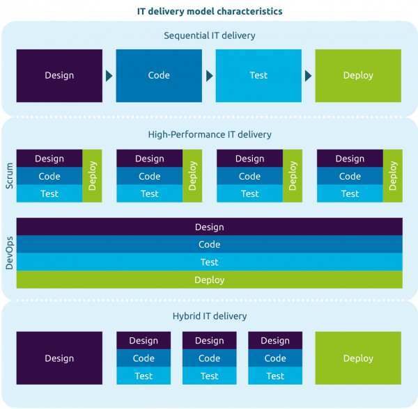 We distinguish three groups of IT delivery models: Sequential IT delivery, High-performance IT delivery and Hybrid IT delivery.